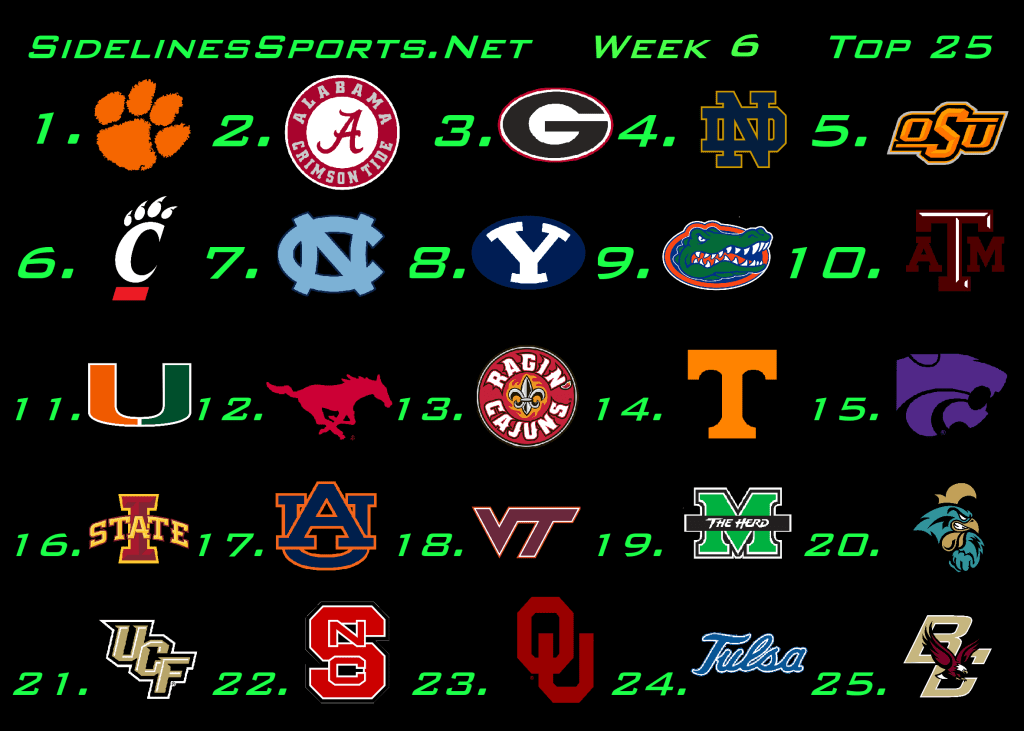 Did the SEC get exposed this week, or did they showcase their top to bottom strength? Regardless, we now have 4 SEC teams in our Top 10, the most of any conference – but, only 1 other in the 25! Oklahoma rejoined us this week as well as new entrants BC, Tulsa and NC State. Will any of these newcomers stick around? Let us know in the replies, forums and on Twitter @Sidelines_SN!