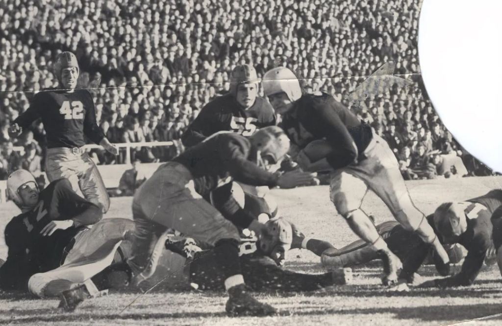 Alright, you can’t complain about the quality of the photo when this game happened over 80 years ago. Perhaps the Iowa “Ironmen” team was best known for quarterback Nike Kinnick, who literally won every major award in the country. But, we also remember this team for a uniform that made them literally look like men of steel, striking fear in even the burliest men of the ’30s.