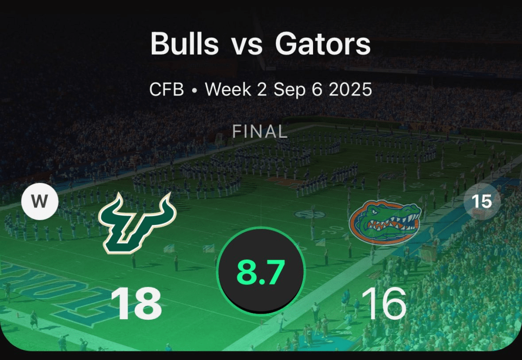 The South Florida Bulls stunned No. 13 Florida 18-16 at Ben Hill Griffin Stadium, securing one of the biggest victories in program history and giving the team back-to-back wins over ranked opponents. The Gators took a 16-15 lead early in the fourth quarter on a short DJ Lagway touchdown pass, but USF quarterback Byrum Brown led a clutch 87-yard drive in the final minutes. Kicker Nico Gramatica sealed the upset with a 20-yard field goal as time expired, delivering a devastating loss to the Gators in Gainesville.